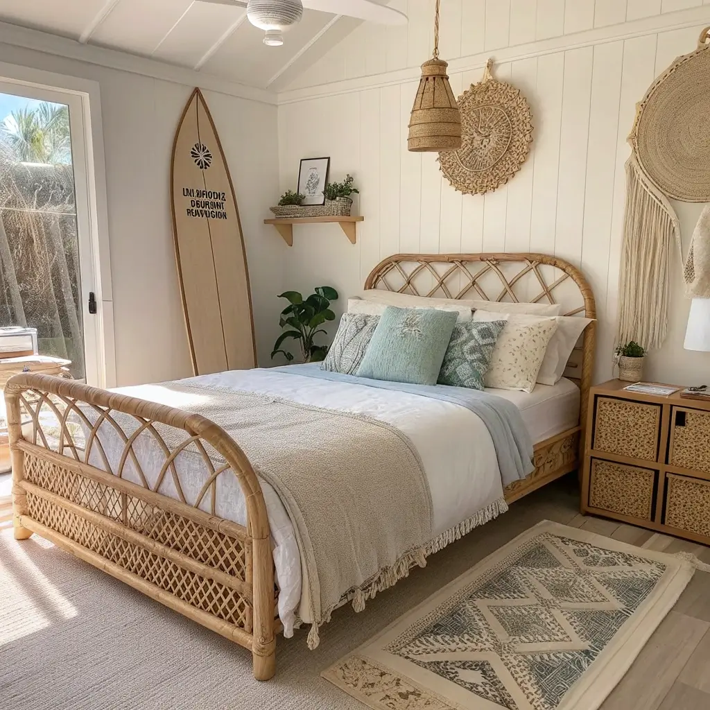 If I had to pick my personal favorite surfer girl bedroom style, the rattan and linen space would top my list. It’s sophisticated, timeless, and achieves that effortless beach vibe without trying too hard.