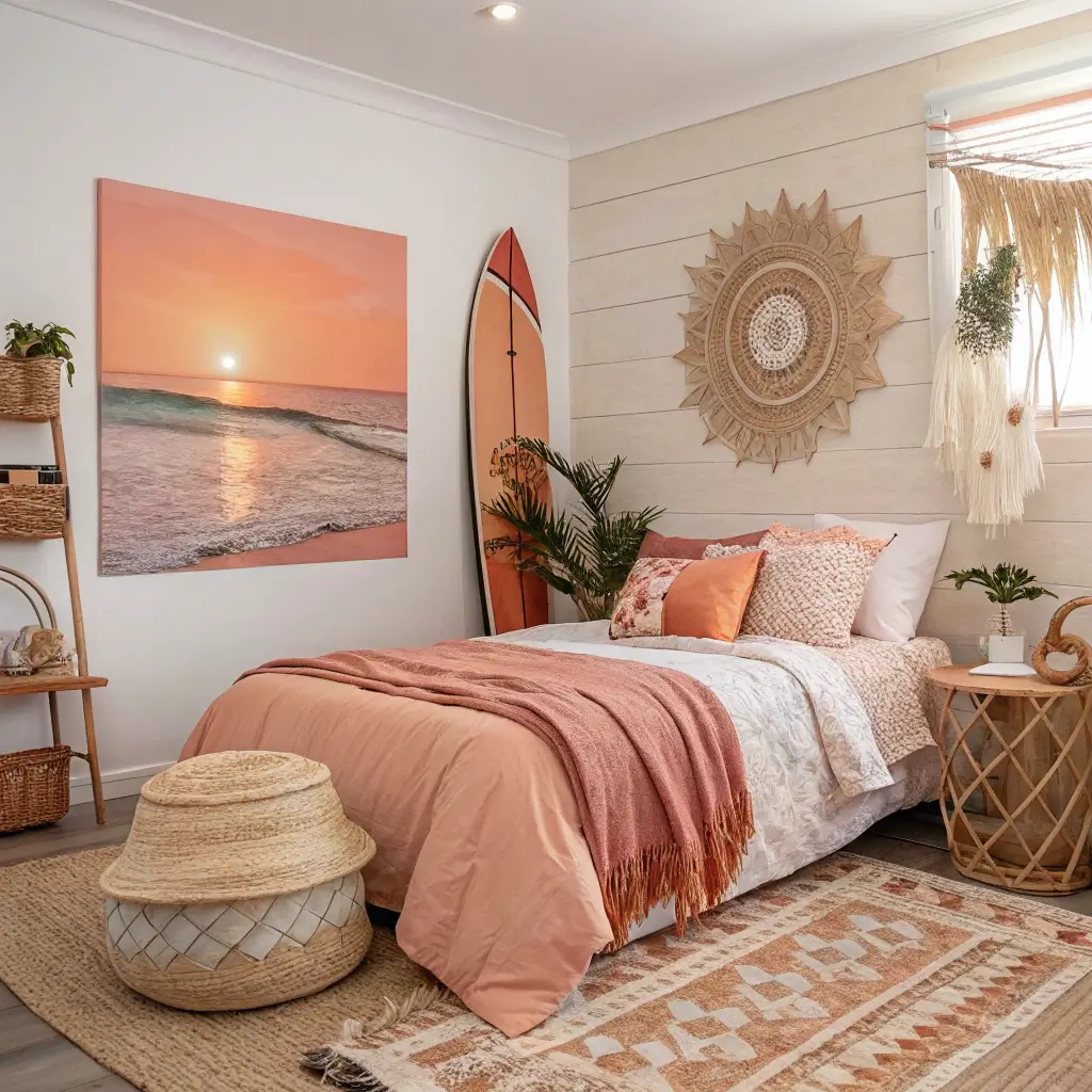 There’s nothing more magical than a beach sunset—those warm peaches, corals, purples, and golds painting the sky as the sun dips below the horizon. The sunset tones surfer girl bedroom captures that daily miracle in room form.