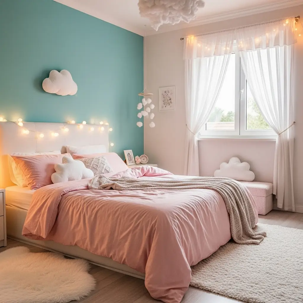 Magic exists, and it lives in romantic teal and pink fairy light bedrooms that create enchanted atmospheres for dreaming. This combination feels like stepping into a fairy tale every time you enter your bedroom.