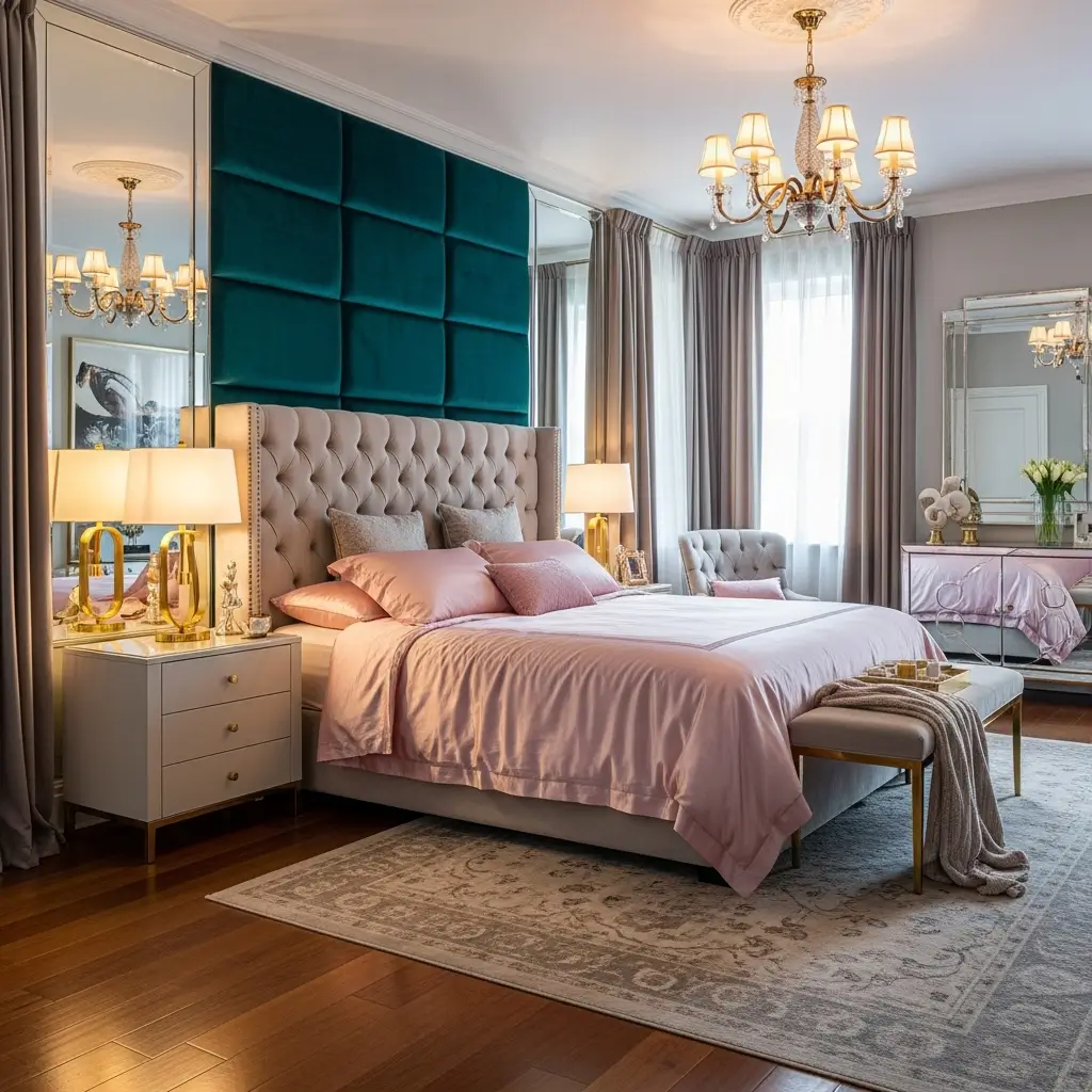Ready for full drama? A glamorous teal and pink luxury bedroom channels old Hollywood with velvet, metallics, and unapologetic opulence. This is for those who believe bedrooms should feel like five-star hotel suites.