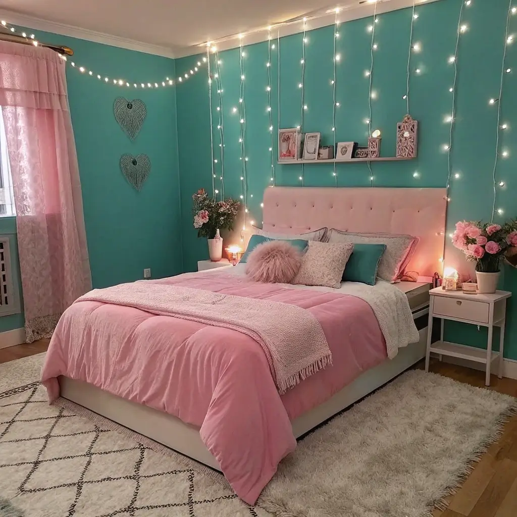 Romantic Teal and Pink Fairy Light Bedroom
