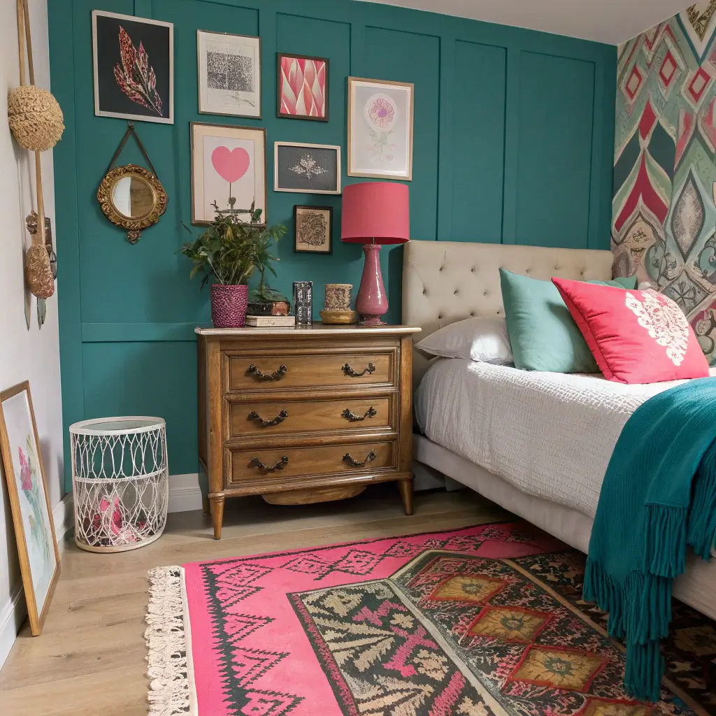 Creative souls who resist categorization – teal and pink eclectic artistic bedrooms celebrate individual expression through mixed styles, collected pieces, and personal meaning. Rules exist only to be thoughtfully broken here.