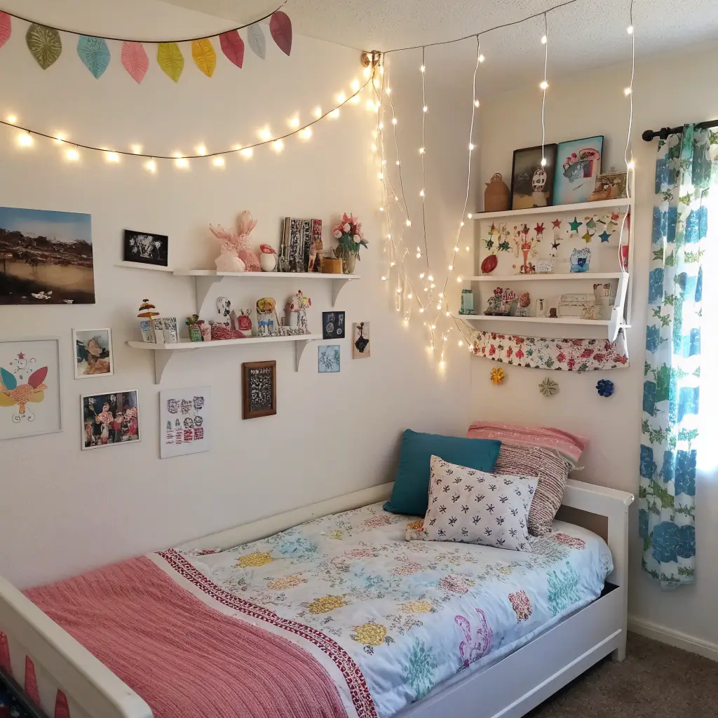 Install wire photo displays that stretch across walls – perfect for showcasing art, photos, or homework she’s proud of. Use washi tape to create geometric patterns that double as photo frames. The tape removes cleanly when she’s ready for change.