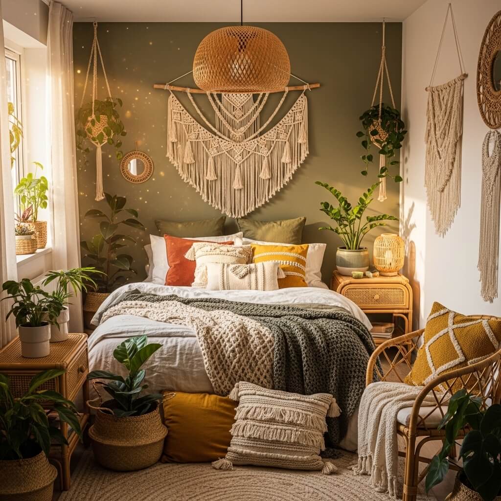 - Macramé wall hangings — one large piece above the bed acts as artwork and texture simultaneously