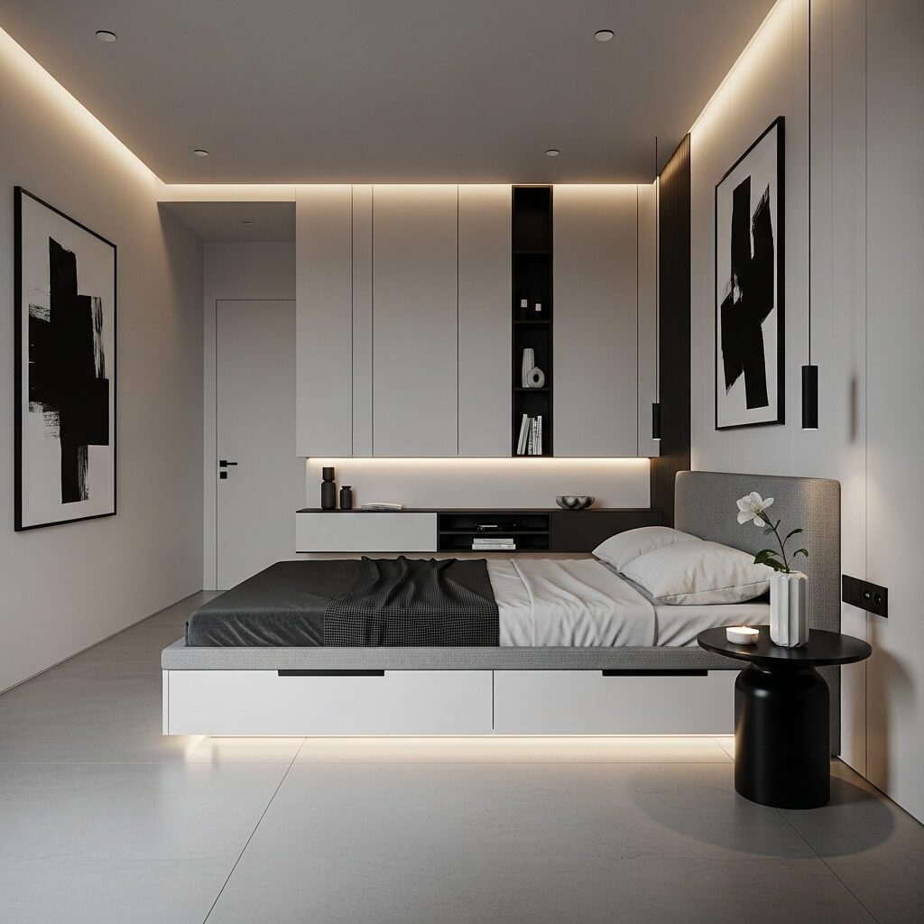 Modern minimal is different from cozy minimal — it’s sharper, cleaner, and slightly more structured. Think crisp lines, monochromatic color schemes, hidden storage, and a very deliberate absence of unnecessary objects. This aesthetic screams sophistication, and it works incredibly well in tiny bedrooms because the simplicity keeps the space feeling open and uncluttered.