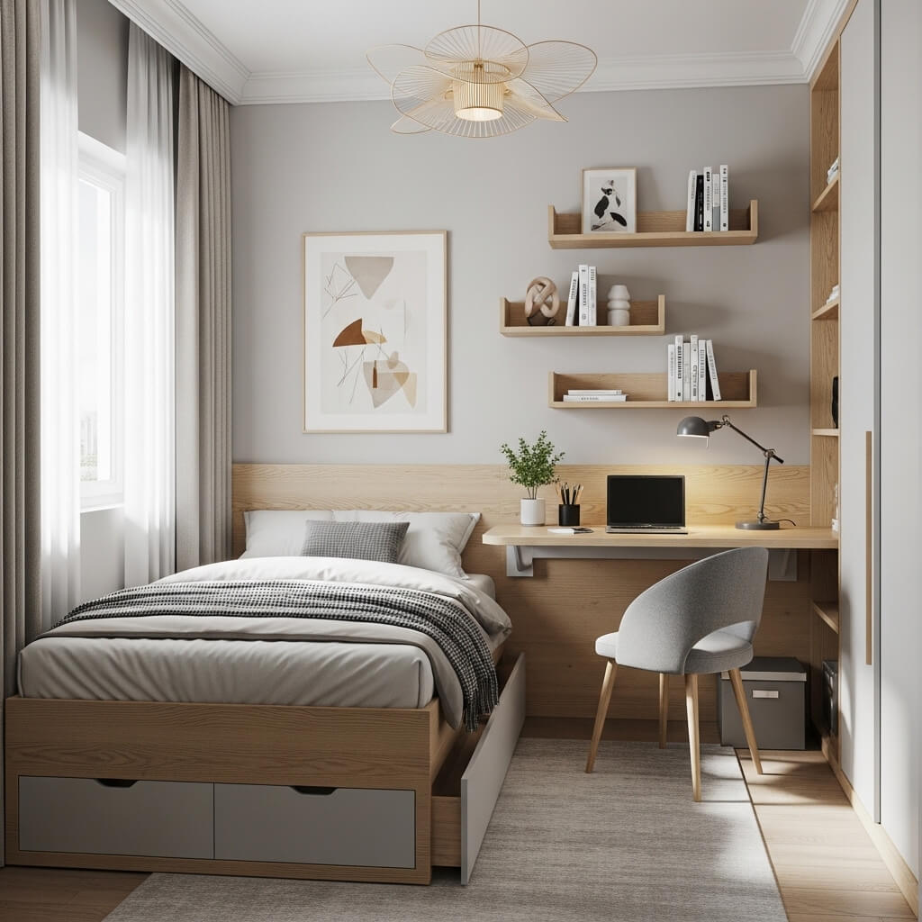 The bed is your biggest opportunity here. A bed with built-in storage drawers underneath is an absolute game-changer. I cannot overstate how much stuff you can store in those drawers — seasonal clothing, extra bedding, books, you name it. Alternatively, a lofted bed frees up floor space below for a desk, shelving, or even a small seating area.