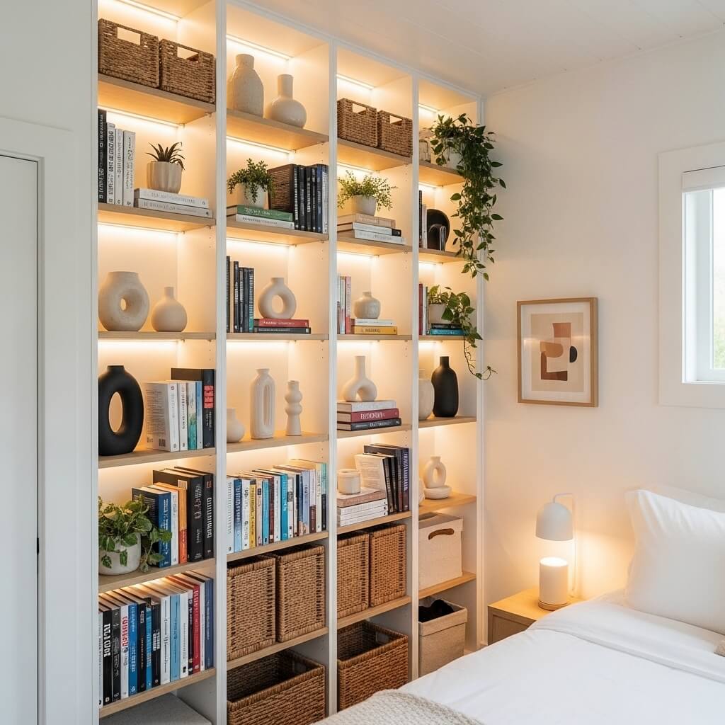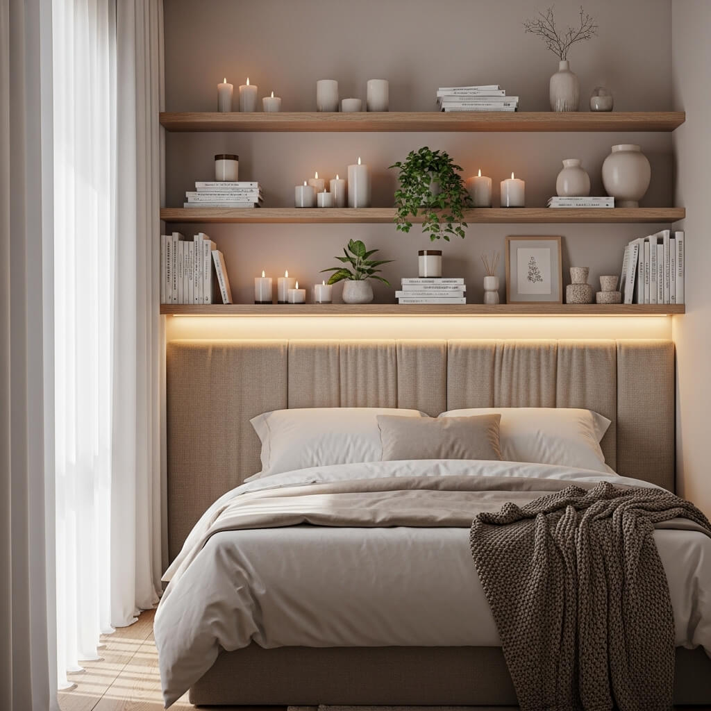 Balance is the key word here. Alternate between taller items and shorter ones, mix textures (wood, ceramic, fabric), and leave some intentional empty space. Empty space is not wasted space — it’s visual breathing room. A cluttered shelf in a tiny room makes the whole space feel smaller and more stressful.
