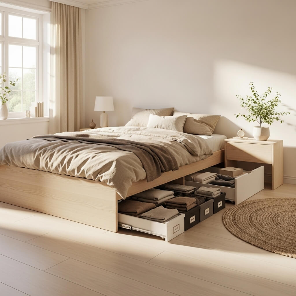 If you’re not using the space under your bed, you’re basically leaving free real estate on the table. Seriously, that zone underneath your mattress is one of the most underutilized spots in any bedroom, and in a tiny room, that’s a crime against organization.
