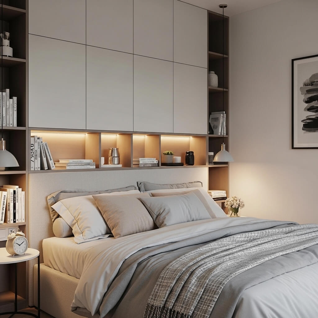 You don’t need a traditional bedside table to have functional bedside storage. Here are some minimal alternatives that work beautifully in small bedrooms: