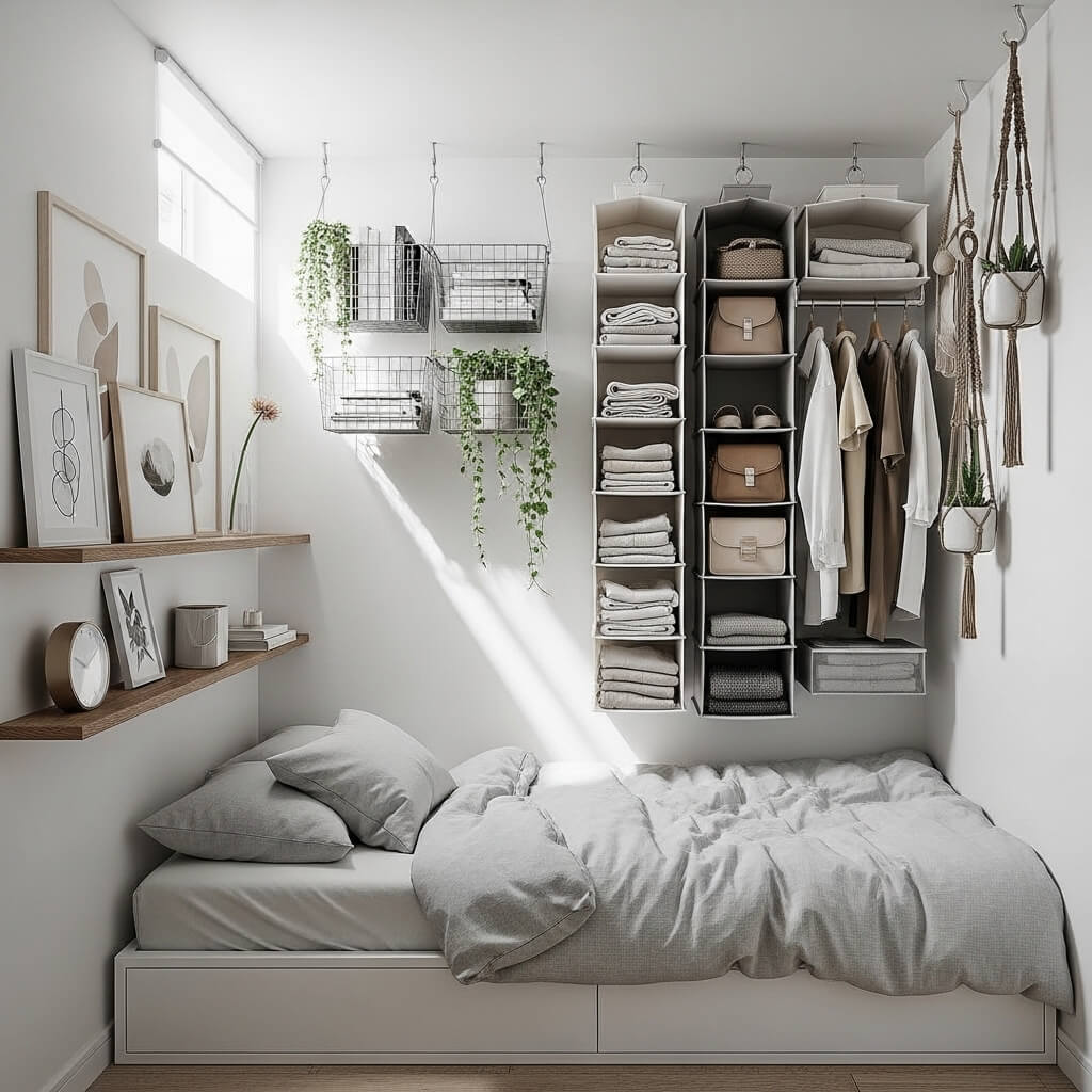 Most people never look up when they think about storage, which is exactly why overhead and hanging storage is such an underutilized goldmine. In a tiny bedroom, training yourself to think vertically — not just horizontally — opens up storage possibilities that feel almost like discovering extra square footage you didn’t know you had.