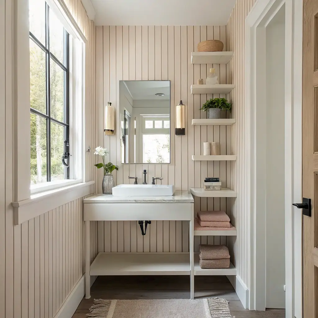 Narrow vertical panels or wallpaper with vertical stripes literally pulls your eye upward, making tiny powder rooms feel taller. I installed narrow beadboard panels painted in soft gray last year, and my 7-foot ceiling suddenly felt cathedral-like.