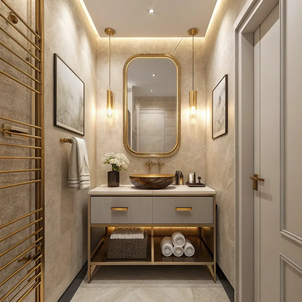 The key is restraint. Too many metallics in a small space looks chaotic, but the right amount adds sophistication. Think metallic faucets, light fixtures, and maybe one statement piece like a copper vessel sink or brass mirror frame.