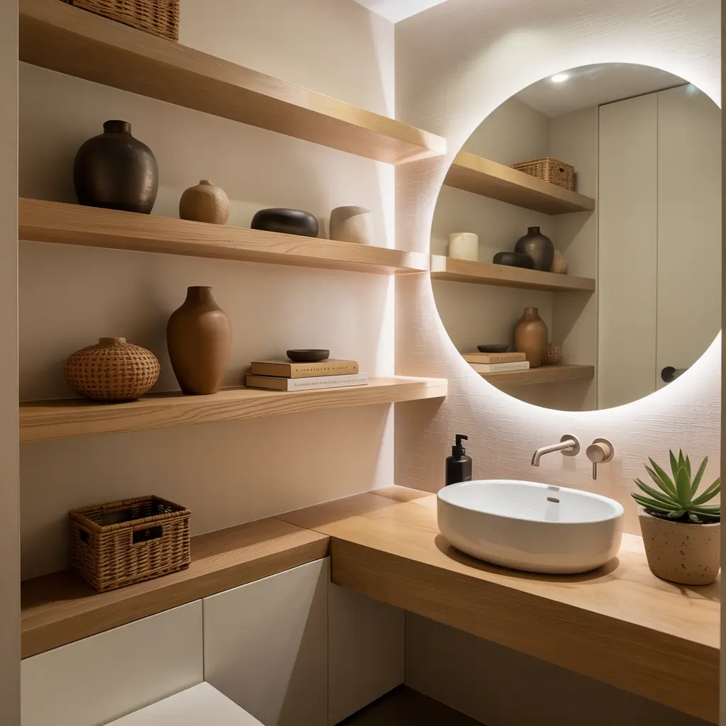 Floating shelves let you add personality without sacrificing precious space. I installed three slim floating shelves in my powder room, and they hold everything from pretty hand towels to tiny succulents, creating layers of visual interest without cluttering.