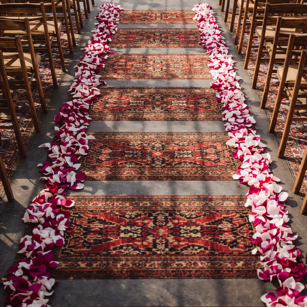 Forget those basic white runners—ethnic carpets transform your aisle into a runway of culture and color. Picture walking down an aisle lined with handwoven Kashmiri carpets or vibrant dhurries. That’s making an entrance with style!