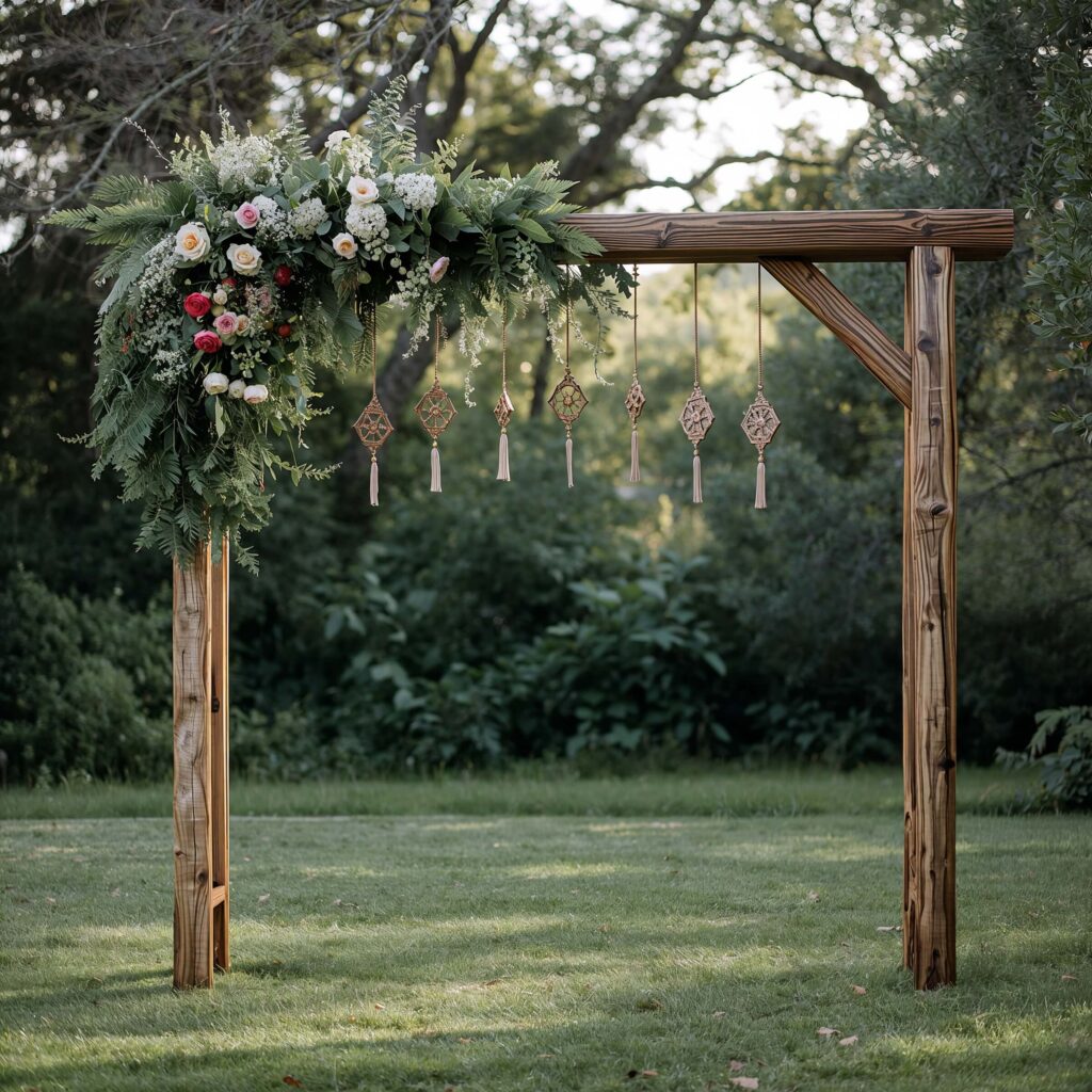 Build your arch using natural materials—bamboo, branches, or reclaimed wood. The imperfect, organic shapes add character you can’t fake. Weave in flowers loosely, allowing some structure to show through. This creates that effortless, gathered-from-the-garden look.