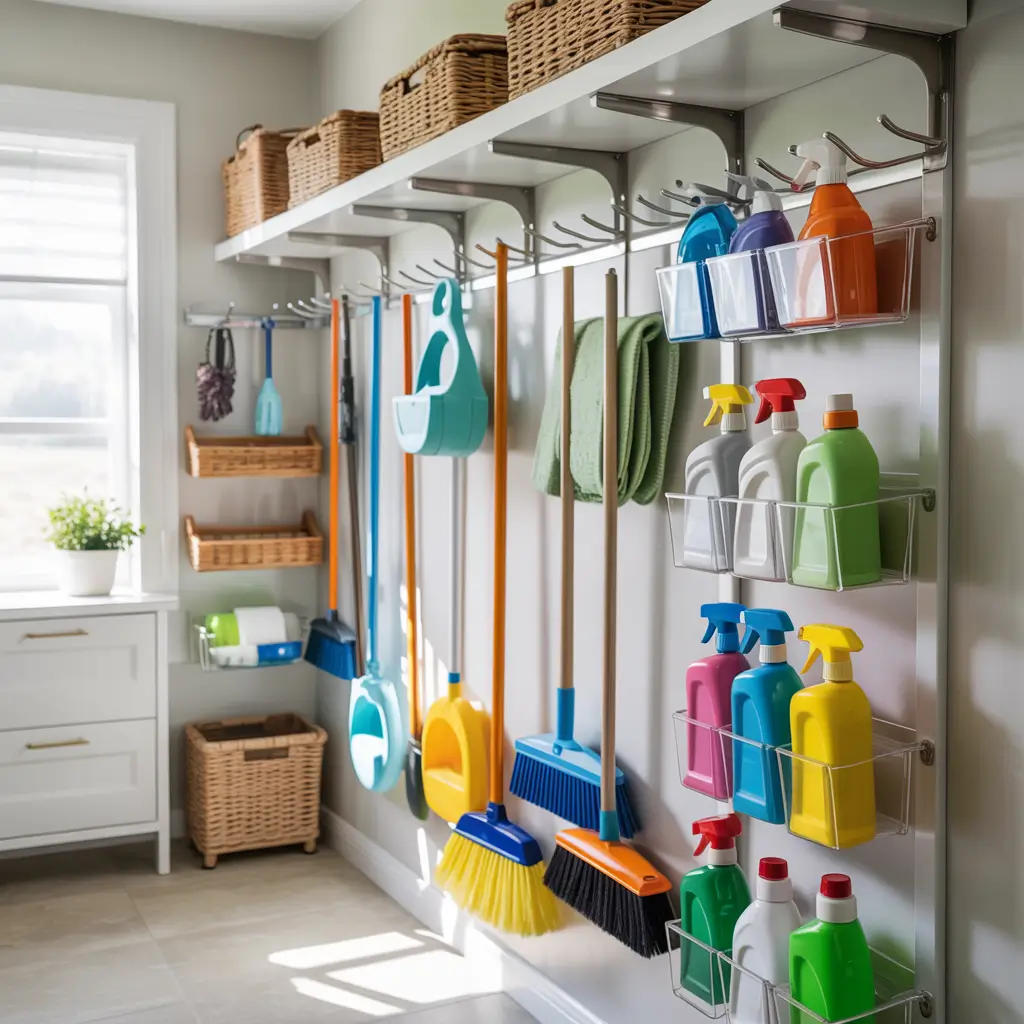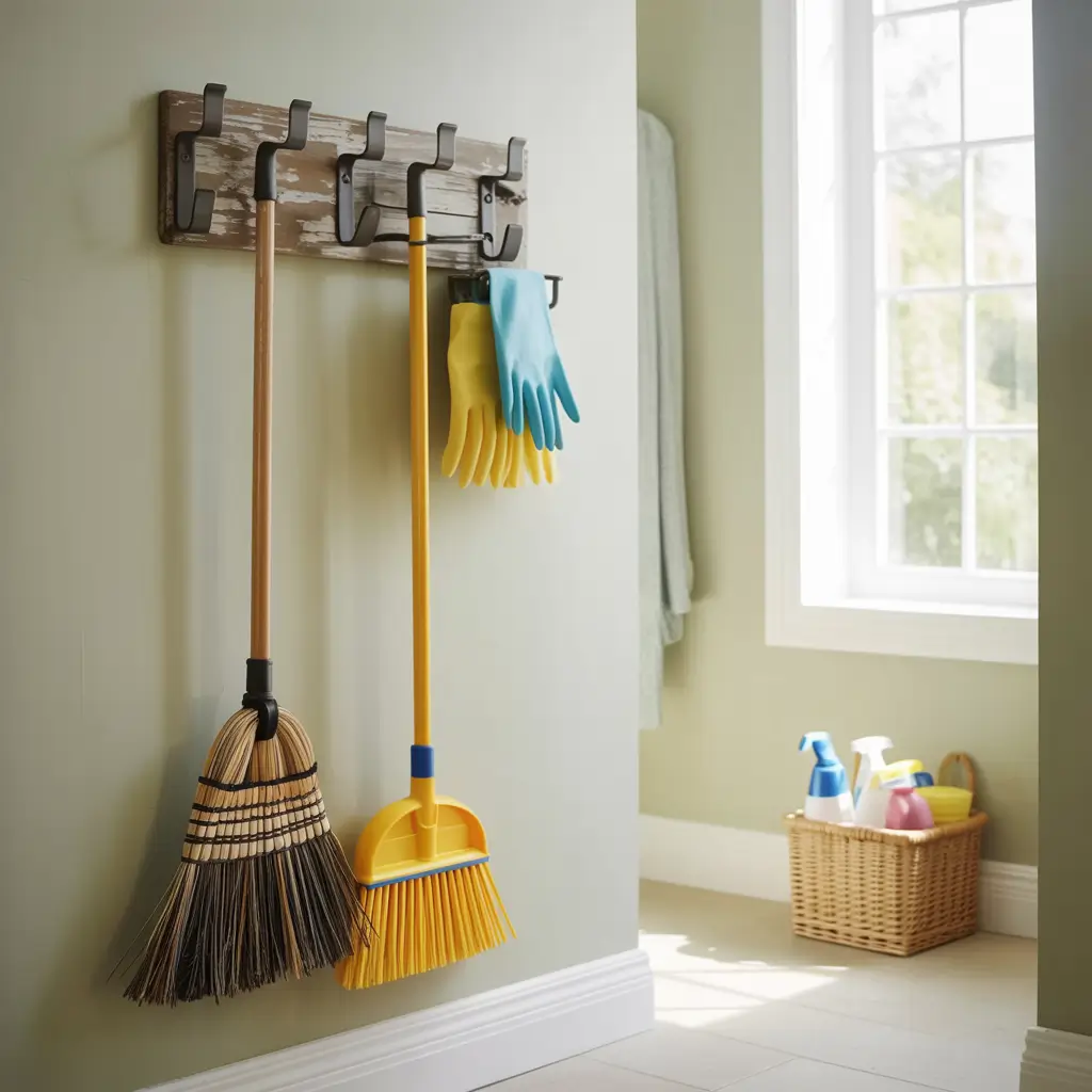 Command strips became my best friend. Large hooks hold the handheld vacuum, medium hooks store cleaning caddies, small hooks keep rubber gloves and dust masks. I even hung a narrow rack for spray bottle refills. Every vertical surface now serves a purpose.