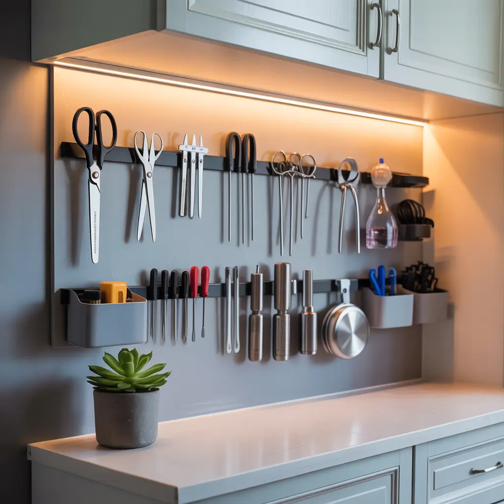 This idea came from watching cooking shows where knives stick to magnetic strips. Why not use the same concept for metal cleaning tools? I installed two magnetic strips, and they hold everything from scissors and scrapers to small metal dustpans.