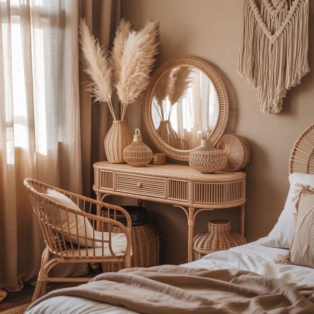Boho Rattan Vanity Setup with Natural Decor