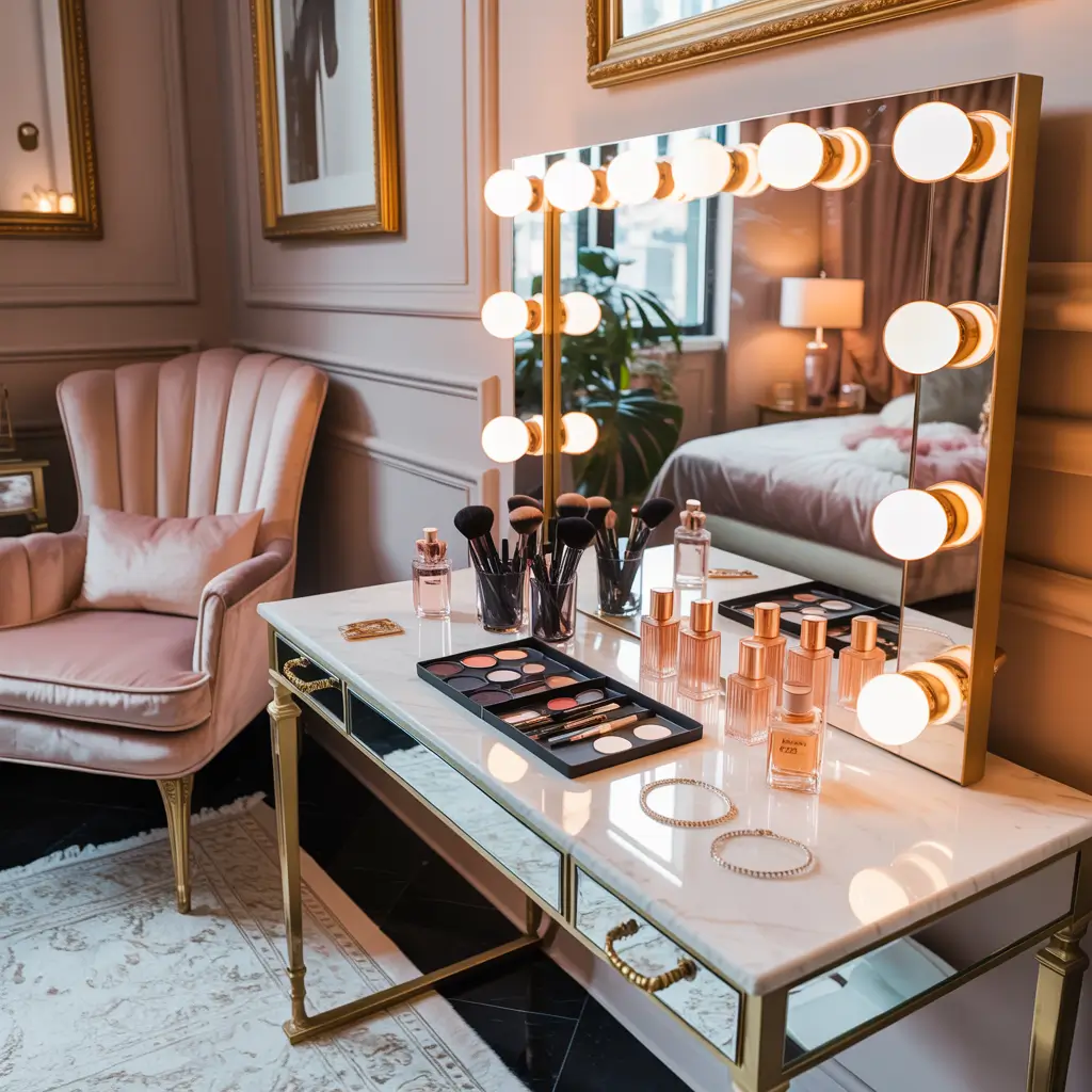 The key to nailing the Hollywood vanity look is going all-in on the glamour. Think mirrored surfaces, metallic accents, plush seating, and yes, those iconic bulb lights. I installed LED bulbs around my existing mirror using a kit from Amazon, and suddenly my boring desk became a backstage dressing room.