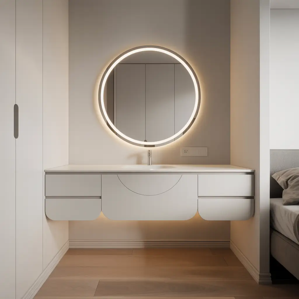 The trick with minimalist corner vanities is choosing pieces that serve multiple purposes. A mirror that opens to reveal storage, a stool with hidden compartments, or a floating desk that doubles as a nightstand. I transformed a dead corner in my 10×10 bedroom with just a triangular floating shelf and a mirror, and suddenly I had a functional vanity that took up literally zero floor space.