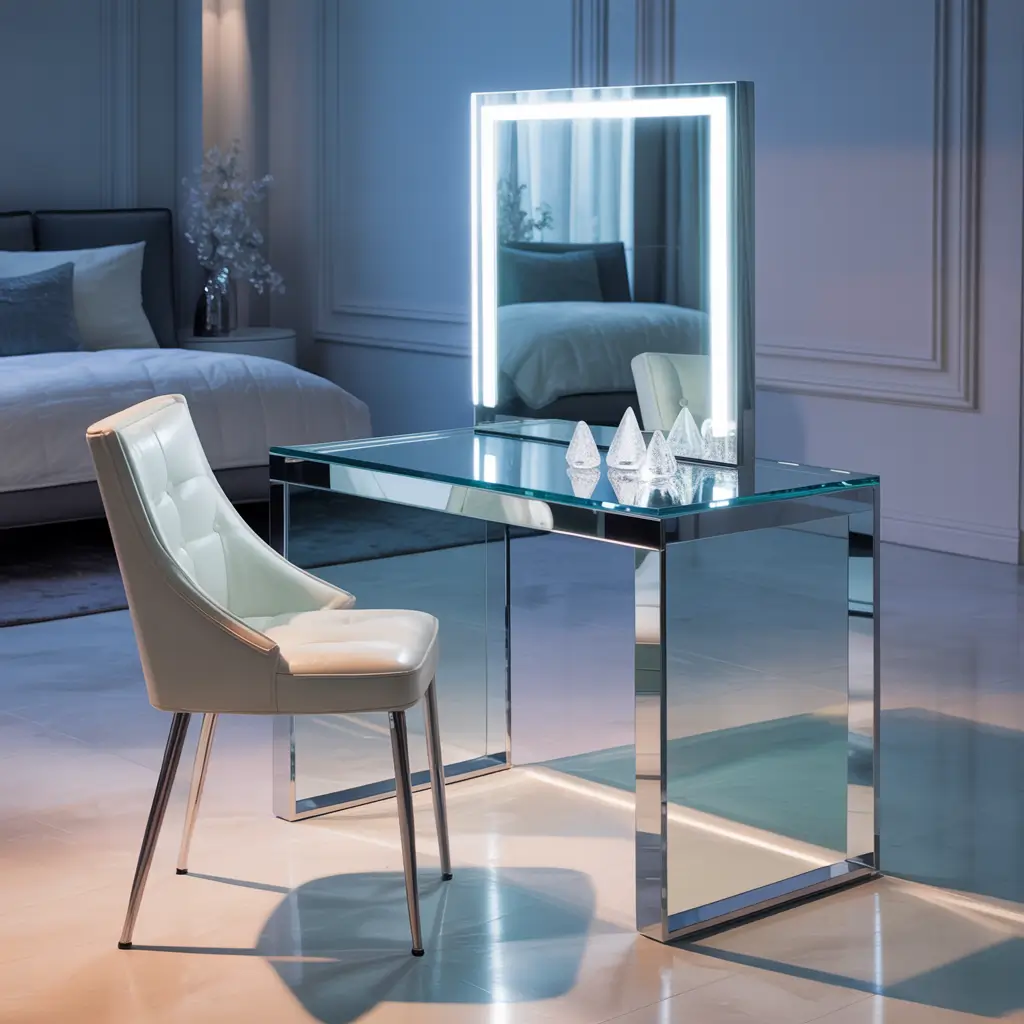 Glass vanities with LED lighting create a futuristic elegance that makes your bedroom feel like a high-end boutique. The transparency keeps spaces feeling open while the LED lighting provides perfect illumination for detailed makeup work.