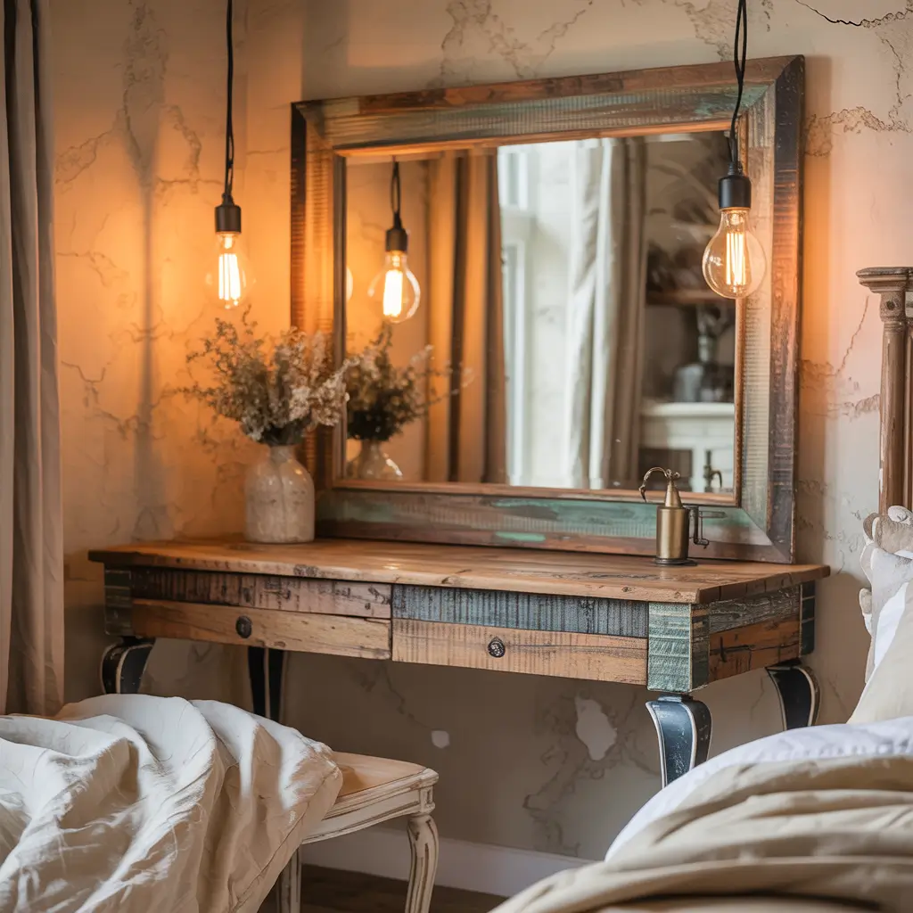 Rustic wooden vanities bring cozy cabin vibes into your bedroom with natural wood grains, warm tones, and that lived-in feeling that makes spaces feel like home. Reclaimed wood, live edges, and visible knots add character that manufactured furniture can’t replicate.