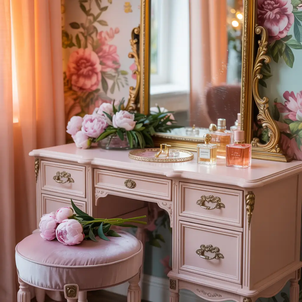 Feminine Pink Vanity Nook with Floral Touches