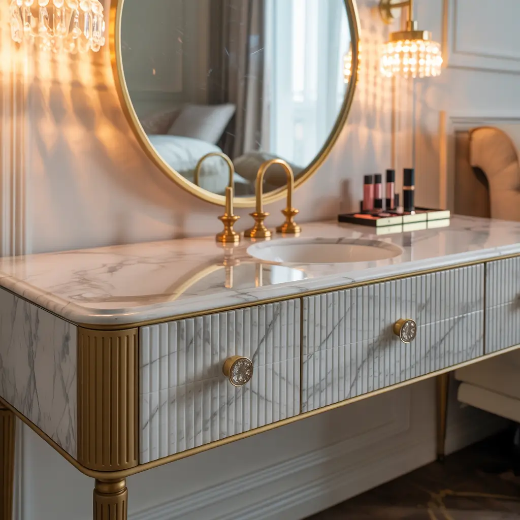 Marble vanities with gold hardware scream expensive taste even if you got everything on sale. The natural veining of marble creates unique patterns that turn your vanity into functional art, while gold hardware adds that final touch of luxury.