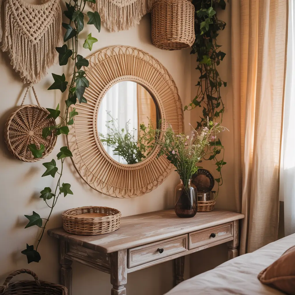 - Natural textures like jute, macrame, or woven baskets