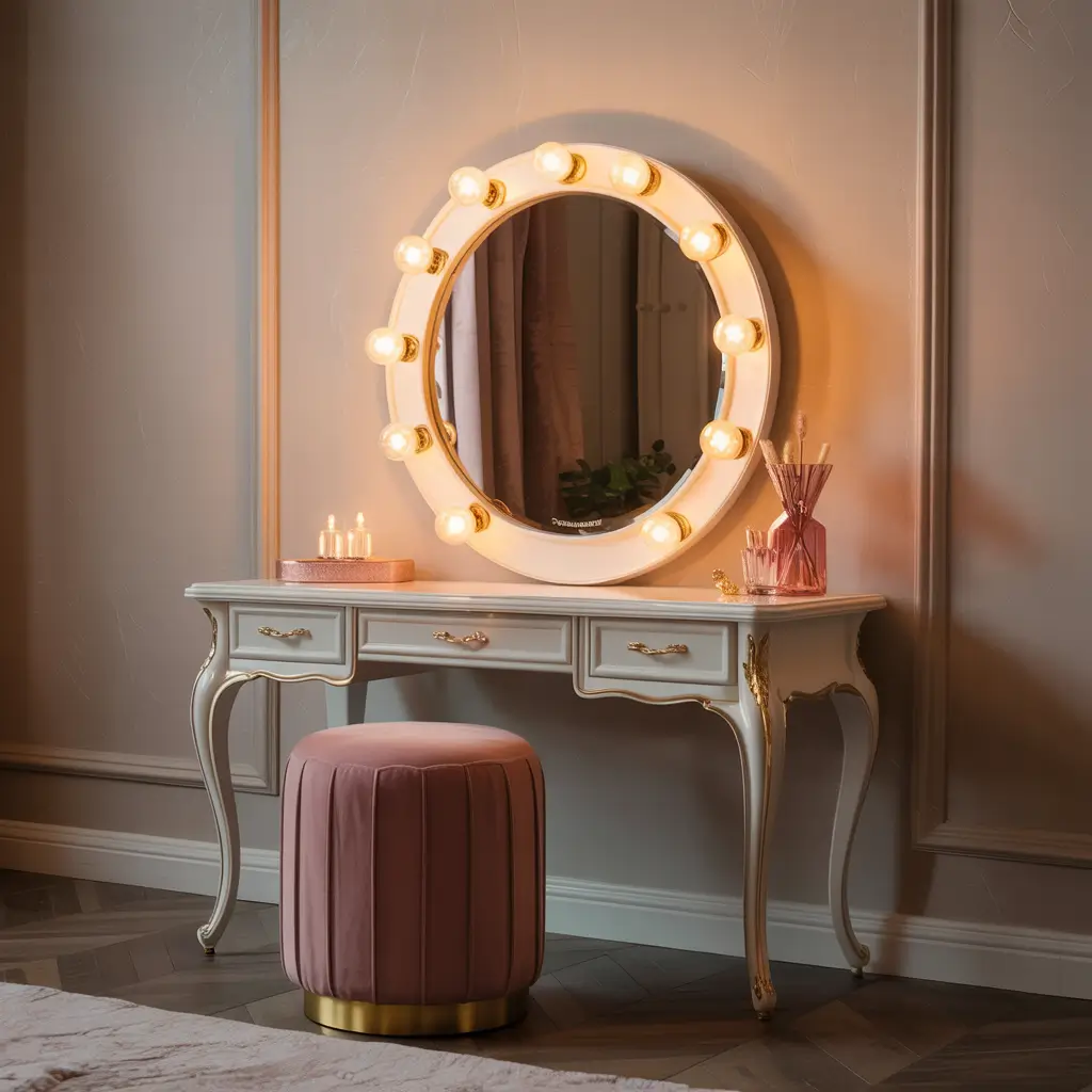 Ever wanted to feel like a movie star getting ready for the red carpet? This vanity style makes that fantasy a reality every single morning. Those iconic bulb lights around the mirror aren’t just for show – they provide the most flattering, even lighting for makeup application.