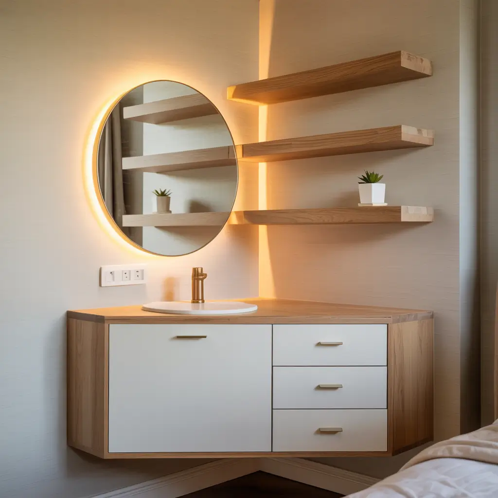 My first apartment had the weirdest bedroom layout, and that corner vanity saved me. I installed floating corner shelves at different heights, creating this cascading effect that looked intentional rather than cramped. The angled setup actually gave me more surface area than a straight wall would have.