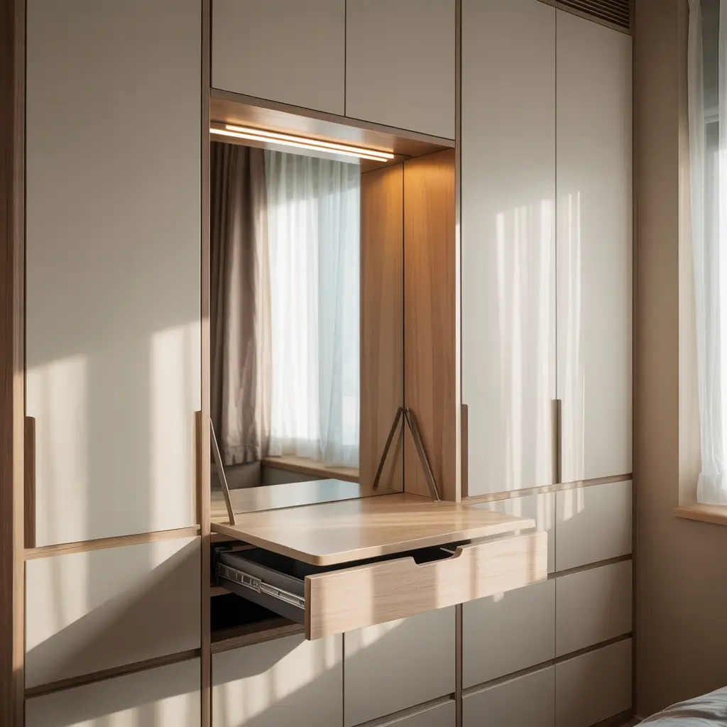 Mine folds completely flat against the wall, and when closed, it looks like a sleek wooden panel. Open it up, and there’s a mirror, little compartments for makeup, and even a small work surface. Game-changer doesn’t even begin to describe it.