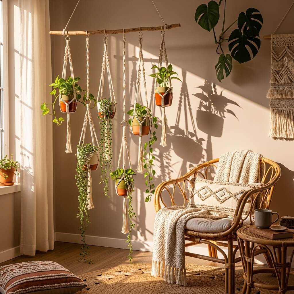 This setup layers multiple macrame hangers at different heights to create a cascading vertical garden. It’s not a single structure but rather a coordinated arrangement that creates vertical impact. I’ve got this going in my bedroom, and it’s exactly the vibe I wanted—relaxed, artistic, and slightly hippie-ish in the best way.