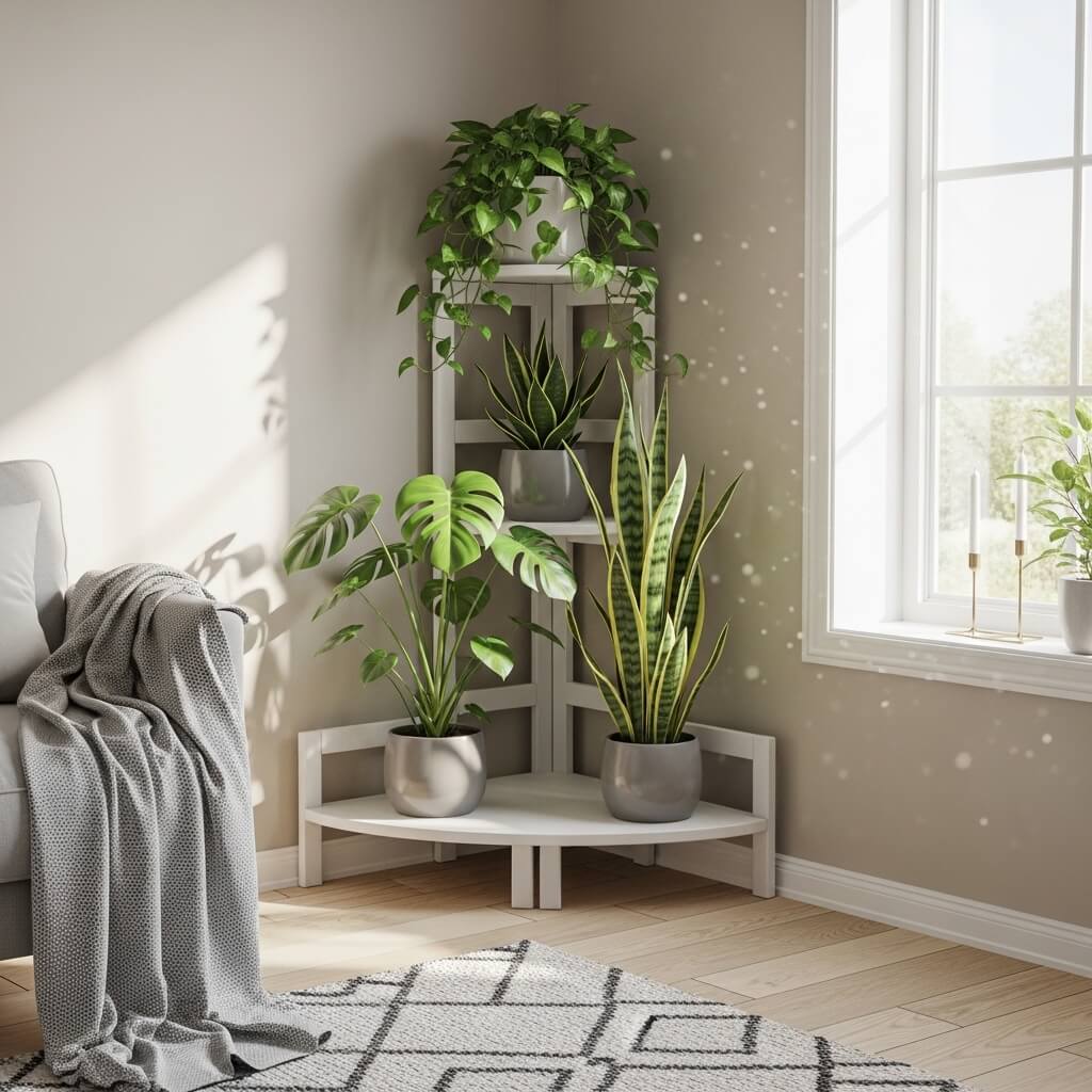 Corner tiered vertical shelves solve this beautifully. These ladder-style or corner-specific shelf units maximize vertical space in those weird angles that normal furniture can’t handle. I’ve got one in my bathroom (plants love humidity) and one in my office corner.