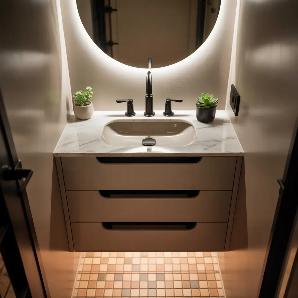 Compact vanities with hidden storage are the Swiss Army knives of very small bathrooms. They provide essential function while hiding the chaos of daily life behind sleek facades.