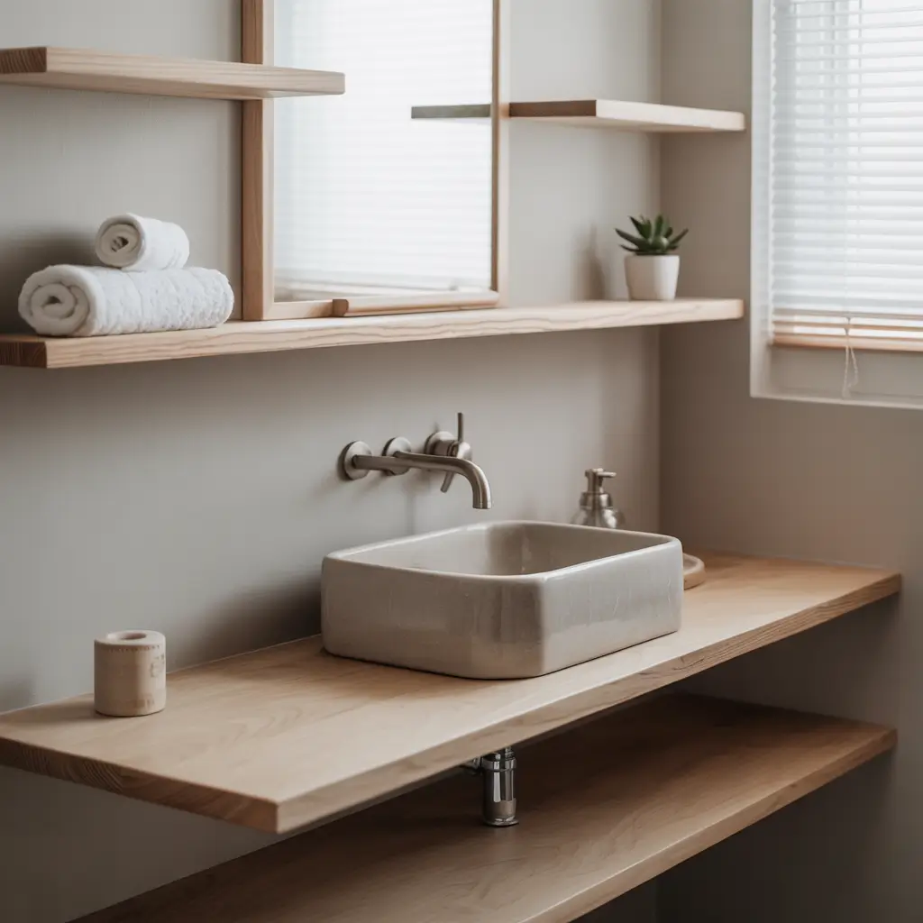 Wall-mounted sinks paired with floating shelves create the illusion of space while providing necessary storage. This combo is perfect for bathrooms where every inch counts.