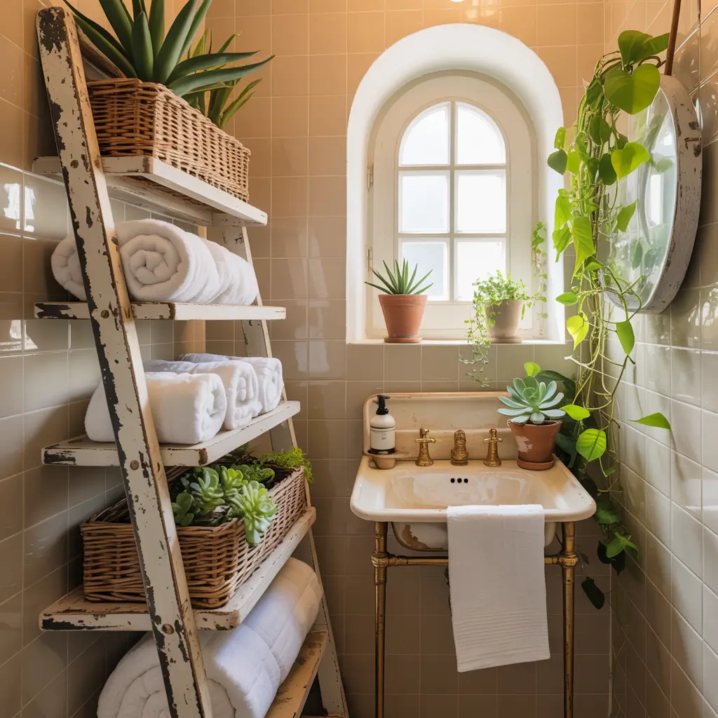 Vertical ladder racks transform dead wall space into stylish storage solutions. This approach draws the eye up while keeping floor space clear in very small bathrooms.