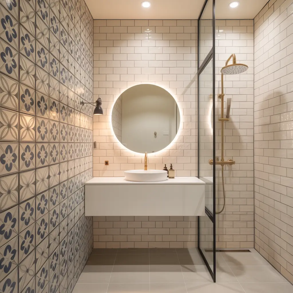 The trick with bold tiles in small spaces is restraint. Choose one wall – usually behind the vanity or in the shower – and let it shine. Keep everything else simple so your accent wall can be the star of the show :/