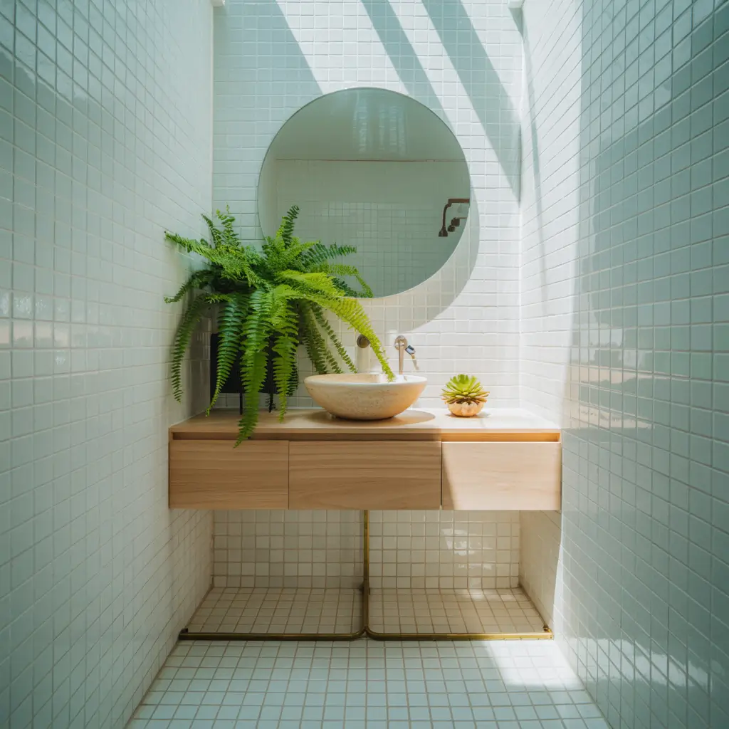 What makes minimalist white tiles perfect for tiny bathrooms is their ability to reflect light from every angle. Choose large format tiles with minimal grout lines, or go classic with subway tiles in a simple pattern. The less visual noise, the bigger the space feels.