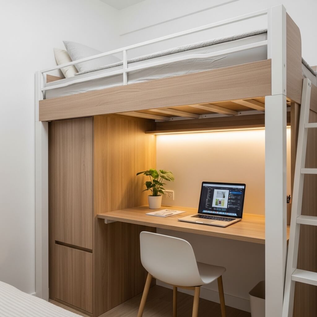 The entire principle behind a loft bed is vertical space optimization. You sleep on top, and the entire footprint of your bed becomes functional living space below. In a tiny bedroom, that’s massive. Depending on your ceiling height and the setup you choose, the space underneath can become: