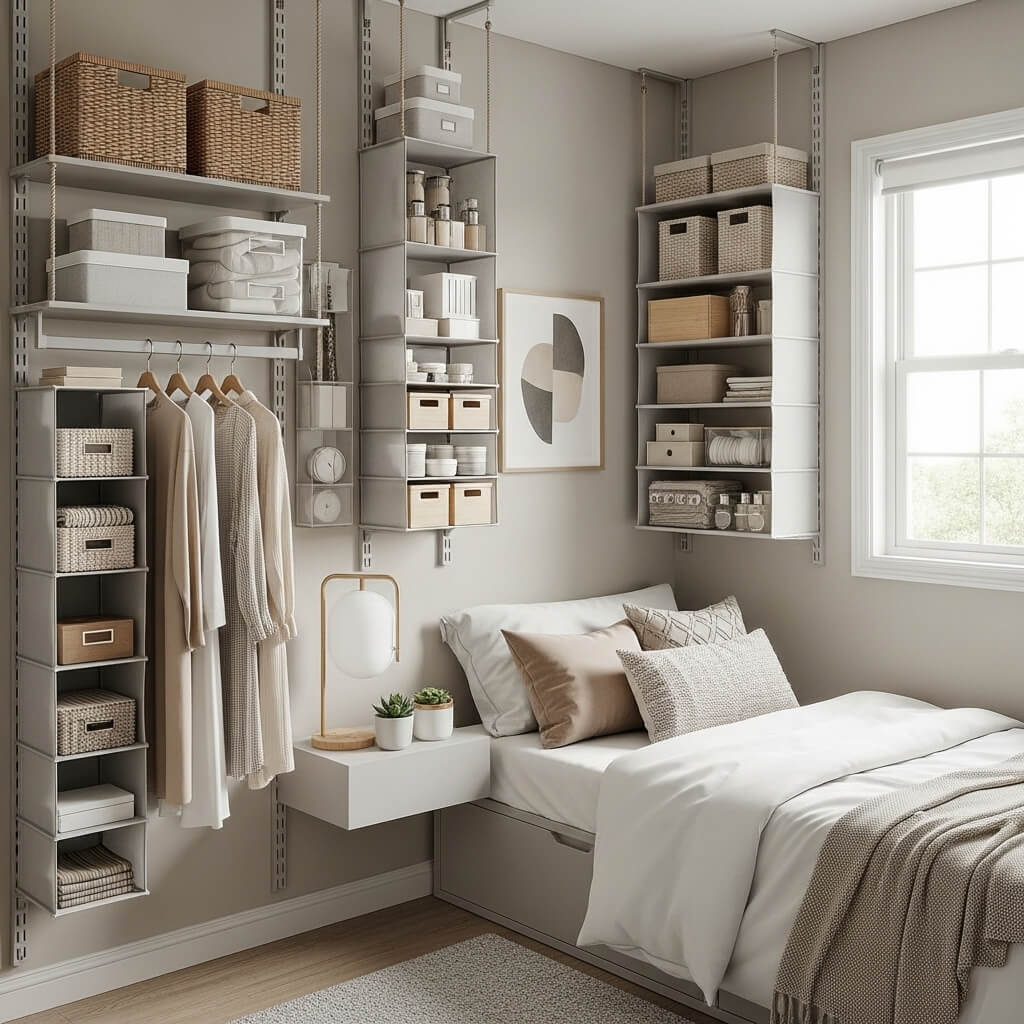 The best vertical wall organizers for bedrooms combine multiple storage functions in one unit. Think hooks, pockets, shelves, and rails all working together on a single wall section. For tiny bedrooms, you want a system that handles as many categories of storage as possible in the smallest horizontal footprint.