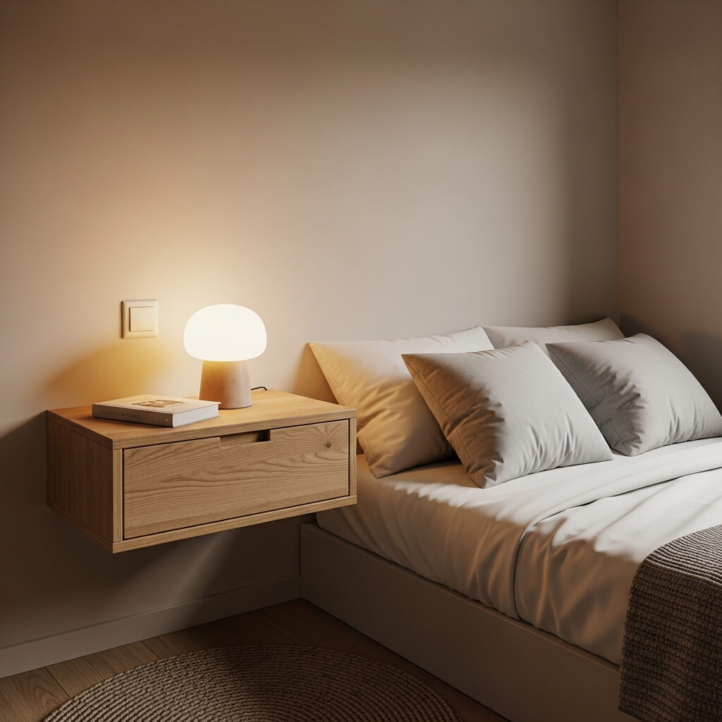 The visual lightness of a hanging nightstand completely changes the feel of a small bedroom. Because there are no legs touching the floor, the eye reads the space as more open. It’s the same reason floating shelves feel less bulky than traditional bookshelves — the perceived floor space expands even if the actual dimensions haven’t changed.