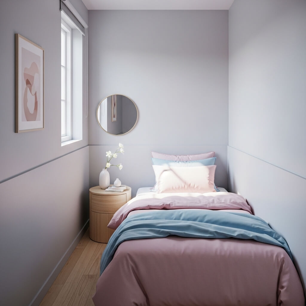 Color is one of the most powerful tools you have in a small bedroom, and it costs significantly less than most furniture upgrades. A light, cohesive color palette makes a tiny bedroom feel larger, brighter, and more open. This isn’t just design opinion — it’s basic light physics. Lighter colors reflect more light, and more light means more perceived space.