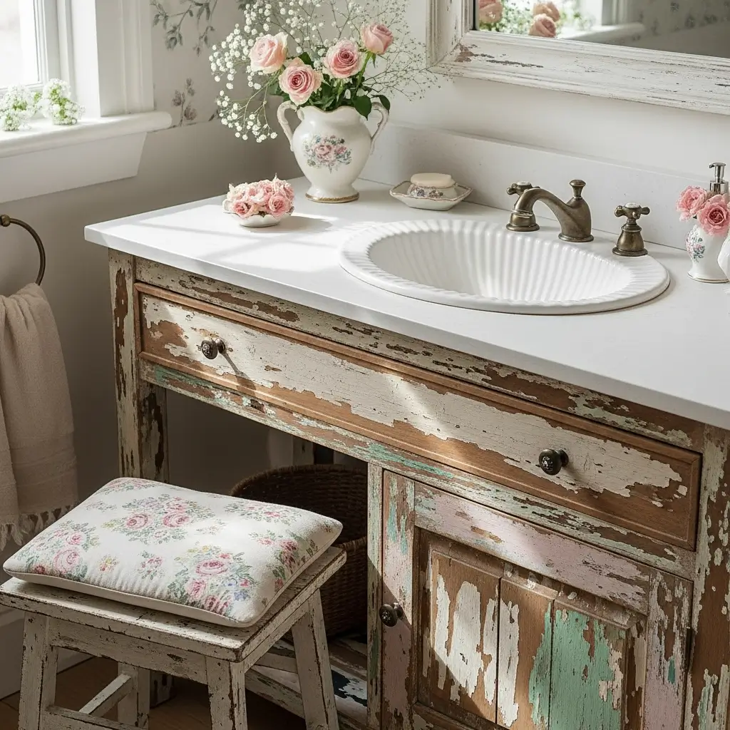 Shabby chic vintage vanities embrace the idea that wear equals beauty. The dresser I converted for my daughter’s bathroom has layers of mint and cream paint showing through strategically distressed spots. It looks like it’s been loved for generations, which technically it has.