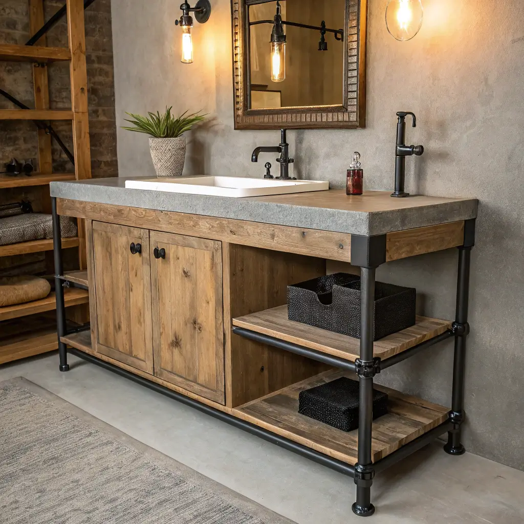 Industrial vintage vanities bring that converted-loft aesthetic to any bathroom. My repurposed factory cart vanity has original casters, metal frame, and wood top scarred from decades of actual industrial use. It’s functional art with genuine history.