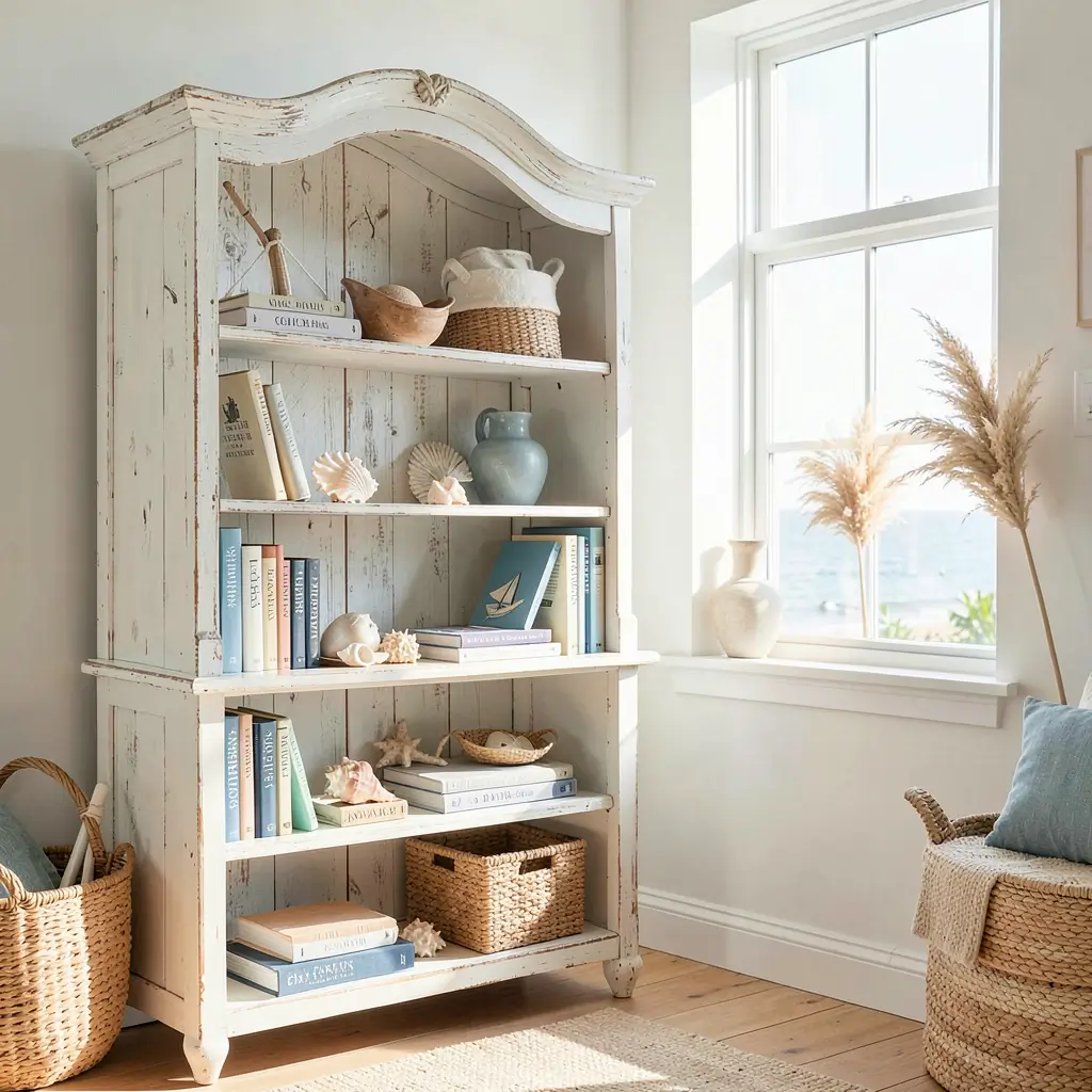 Coastal vintage bookshelves bring beach house vibes without sand in your carpet. These pieces combine weathered wood with nautical elements for that permanent vacation feeling.
