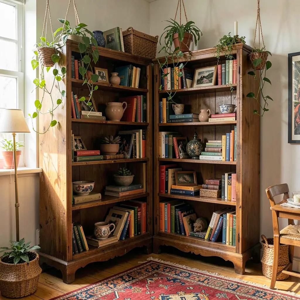 Classic library style vintage bookshelves transport you to those mahogany-paneled rooms where leather-bound books whisper secrets. Even if your “library” is actually a corner of your bedroom, these pieces create that scholarly atmosphere.