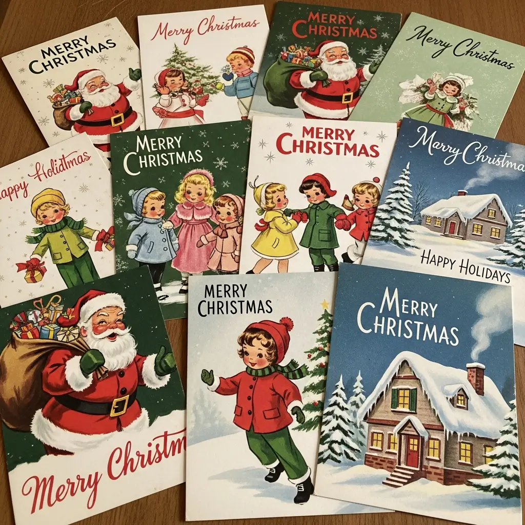 Christmas cards in the 1950s weren’t just greetings – they were miniature works of art. Families saved them year after year, creating collections that chronicled changing design trends and family milestones.