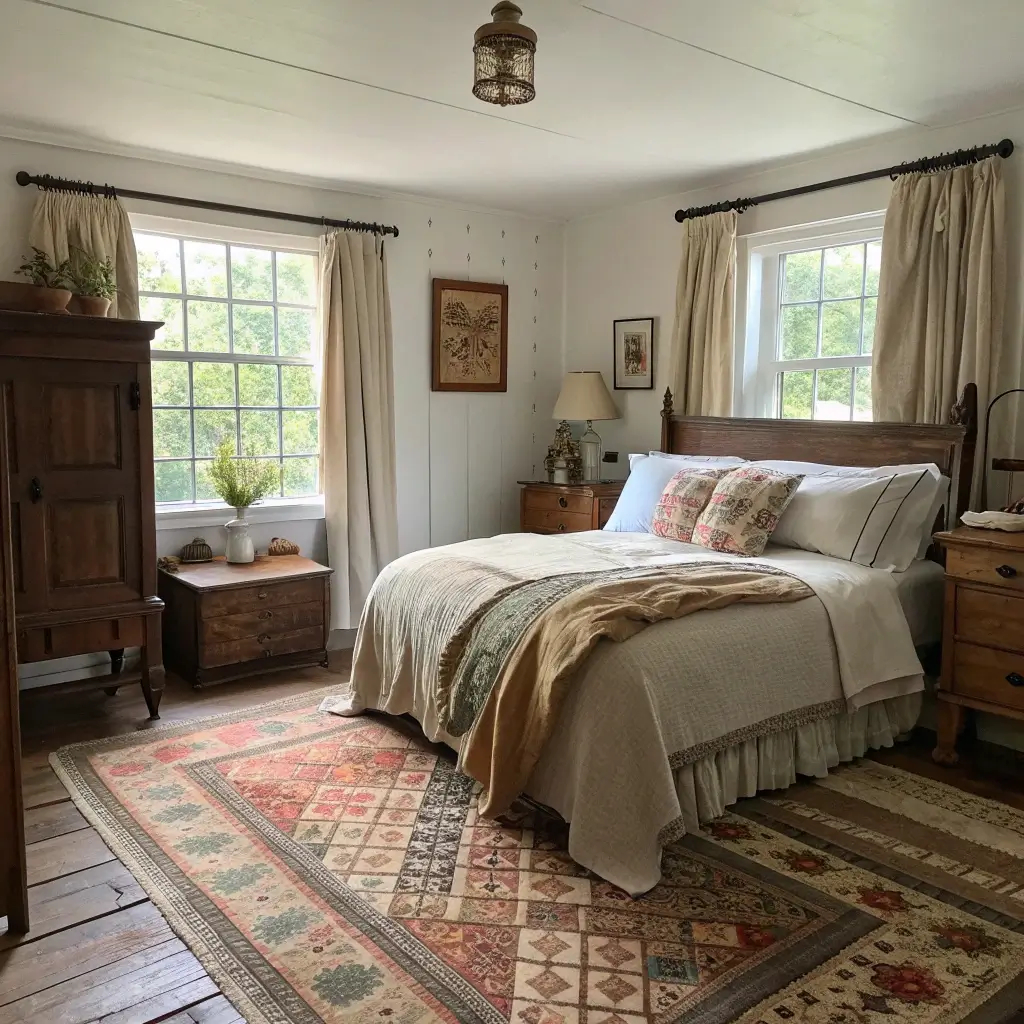 Curtains, rugs, and textiles soften vintage farmhouse bedrooms while adding essential warmth and color. These fabric elements humanize spaces, making them feel lived-in rather than staged.