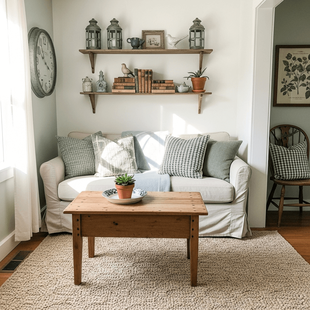I live in 800 square feet, and my living room proves that vintage farmhouse works in compact spaces. The trick is choosing scaled-appropriate pieces and using vertical space smartly. That massive farmhouse table? Doesn’t fit. A smaller vintage drop-leaf table? Perfect.